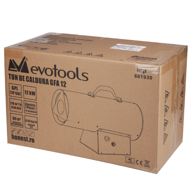 Evotools Tun de caldura pe gaz GPL, 12 kW, flux aer 170 mc/h, incalzire rapida santier si atelier, suprafata 86 mp