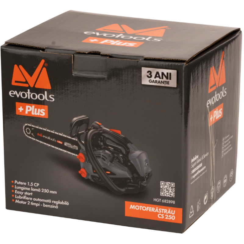 Motoferăstrău cu Benzină EvoTools Plus CS 250, Motor 2 Timpi 1,5 CP, Lamă 250 mm, Lubrifiere Automată, Frână de Lanț