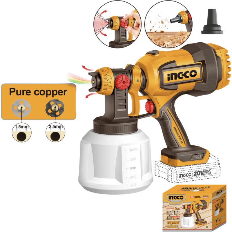 Pistol de Vopsit 20V Fără Fir INGCO cu Funcție 2-în-1, Duze din Cupru 1.5mm și 2.5mm, Debit 800ml/min
