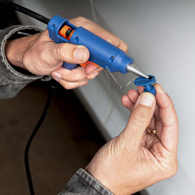 Adezivare: Încălziți pistolul de lipit și aplicați adeziv fierbinte pe unul dintre cele 18 adaptoare, selectat în funcție de mărimea și forma loviturii.