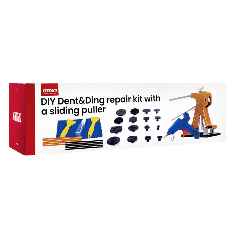 Kit Profesional AMiO DIY pentru Reparații de Îndoituri Fără Vopsire (PDR), cu Extractor Glisant 04599 Kit profesional complet pentru îndepărtarea rapidă și eficientă a micilor și marilor lovituri de pe caroseria auto, fără a afecta vopseaua. Piesa centrală este extractorul glisant reglabil, care, împreună cu cele 18 adaptoare de diferite forme și dimensiuni, permite ajustarea forței de tracțiune pentru a readuce tabla la forma inițială. Este o soluție economică și rapidă, ideală atât pentru service-uri, cât și pentru reparațiile efectuate acasă.