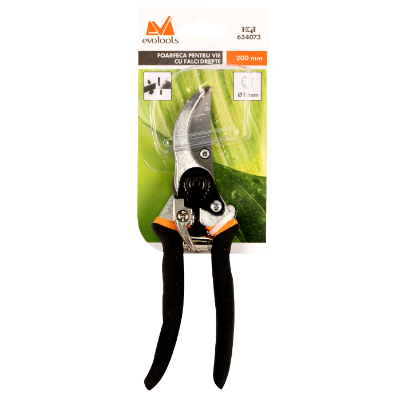 Foarfecă pentru vie cu fălci drepte, 200 mm, oțel carbon, mâner ergonomic PVC Foarfeca pentru vie EvoTools este o unealtă eficientă și ușor de utilizat, concepută pentru tăierea precisă a ramurilor și întreținerea plantelor. Realizată din oțel carbon de înaltă calitate, tratat termic, aceasta oferă durabilitate și performanță constantă în lucrările de grădinărit.
