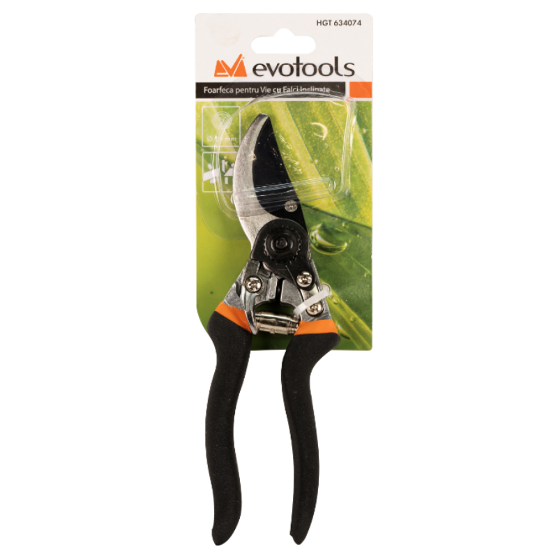 Foarfecă pentru vie cu fălci înclinate, 210 mm, oțel călit, mâner ergonomic anti-alunecare Foarfeca pentru vie este o unealtă practică și eficientă, destinată tăierii crengilor subțiri și întreținerii viței de vie. Lamele cu profil înclinat din oțel călit asigură o tăiere precisă și controlată, iar designul ergonomic oferă confort în utilizare.